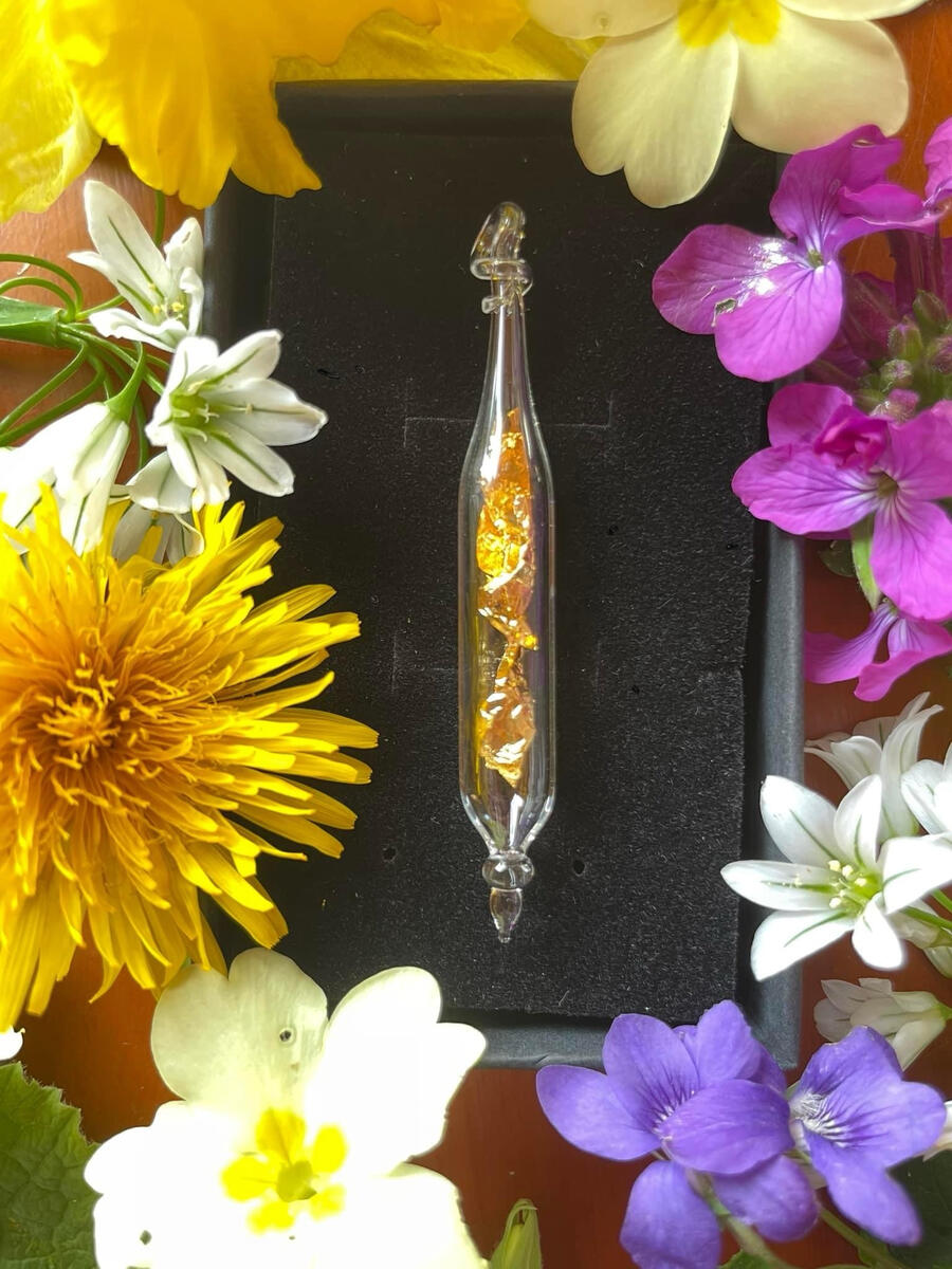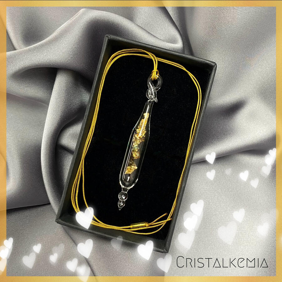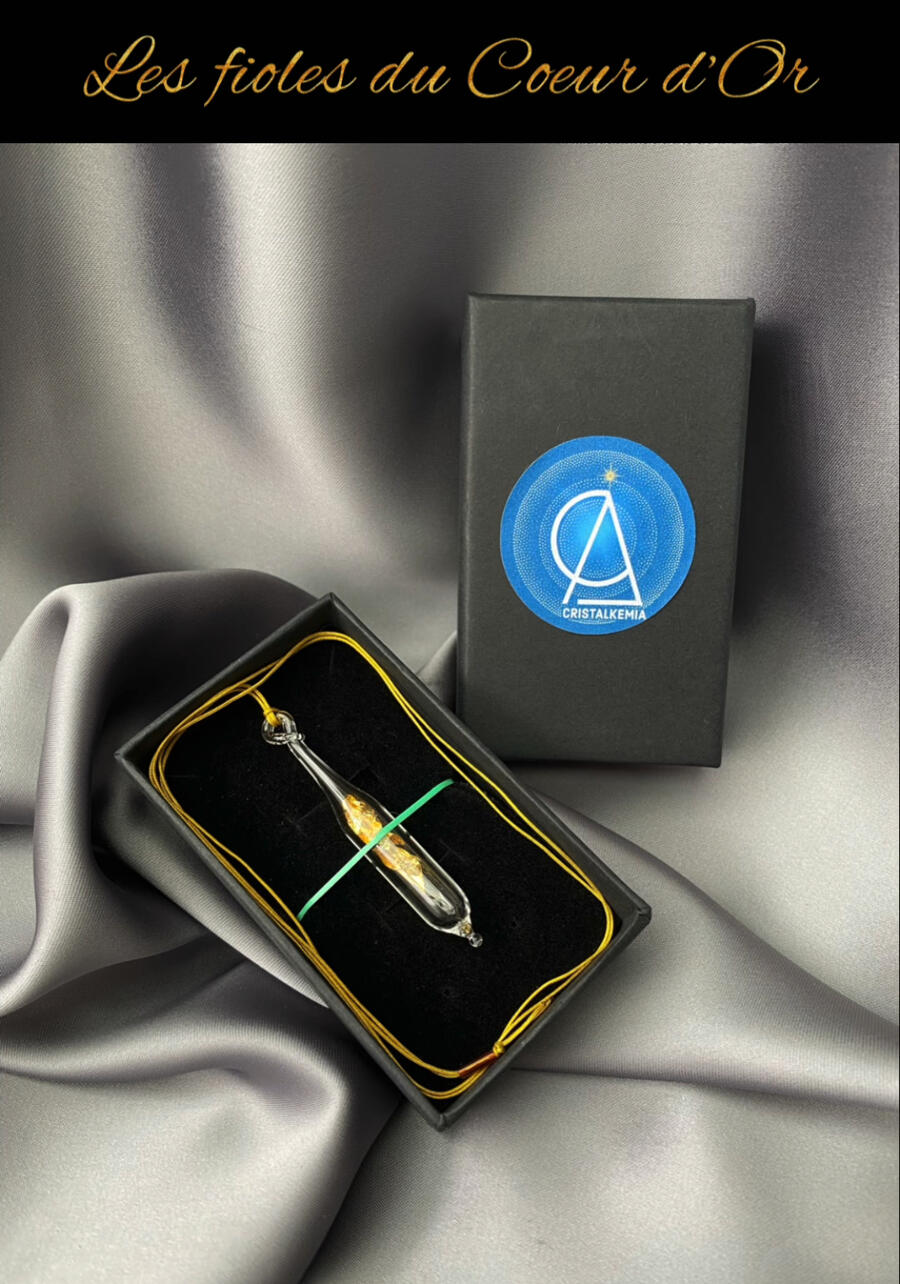 Une création consciente, sacrée et universelle, qui se donne par la joie d'être et de partager.À l'atelier de verre filé (là où tout est possible!) je viens fusionner le verre dans la flamme du chalumeau, souffle, ouvre, et vient insérer ce fragment de feuille d'or 24 Carats avant de refermer la fiole.Une fiole peut être portée en pendentif, suspendue à la lumière du soleil, utilisée comme pendule, lors de soins, ou encore plongée dans votre eau de boisson pour l'informer des fréquences or.