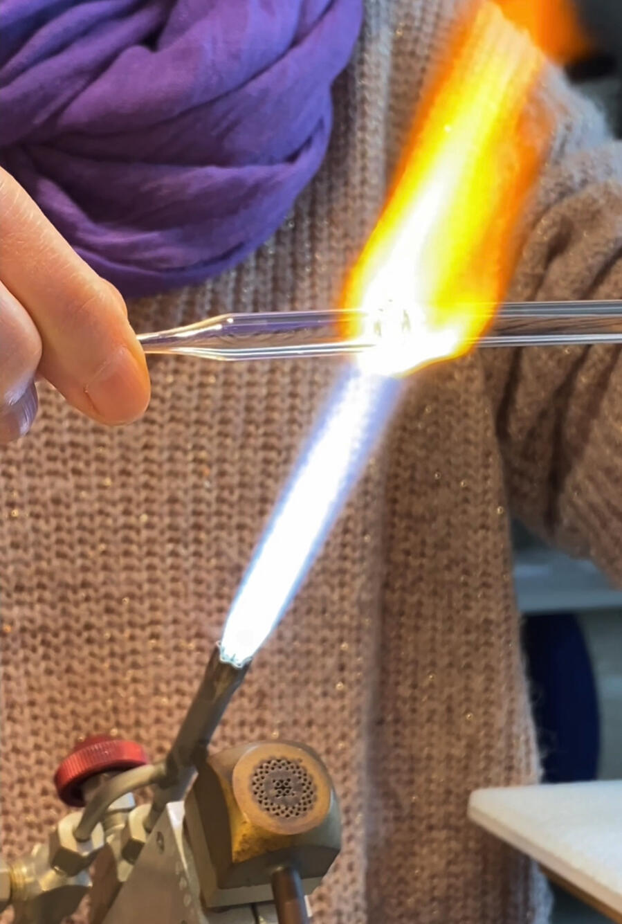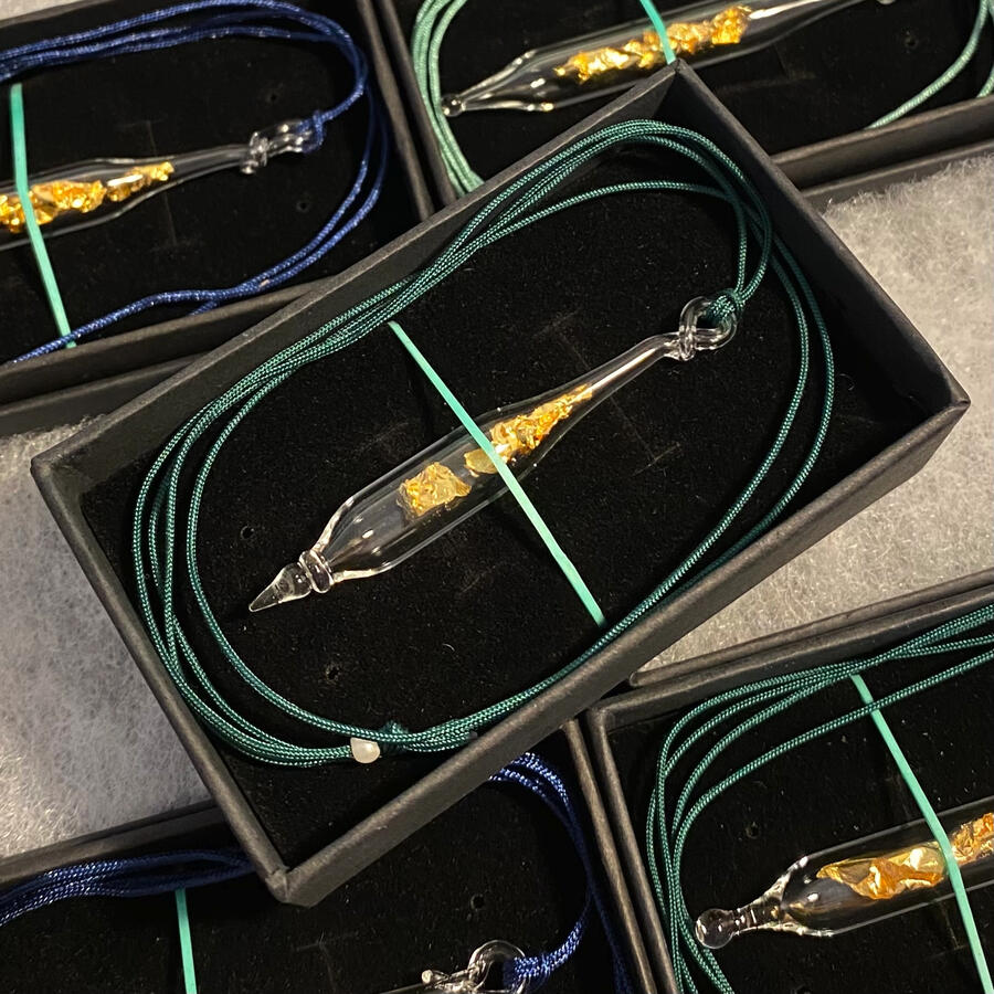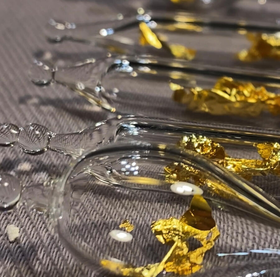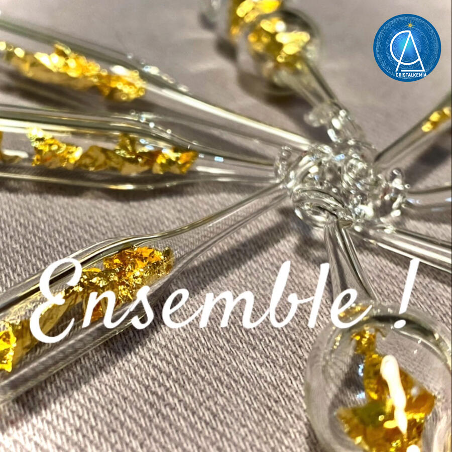 Une création consciente, sacrée et universelle, qui se donne par la joie d'être et de partager.À l'atelier de verre filé (là où tout est possible!) je viens fusionner le verre dans la flamme du chalumeau, souffle, ouvre, et vient insérer ce fragment de feuille d'or 24 Carats avant de refermer la fiole.Une fiole peut être portée en pendentif, suspendue à la lumière du soleil, utilisée comme pendule, lors de soins, ou encore plongée dans votre eau de boisson pour l'informer des fréquences or.